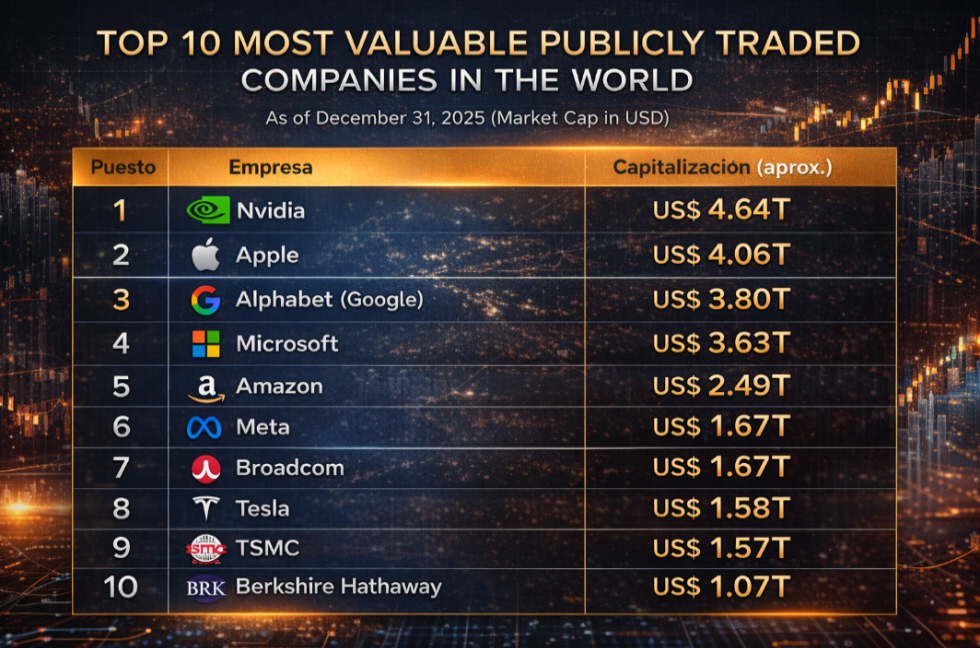 Sixty of the world’s 100 most valuable firms are based in the United States, and eight American companies are ranked among the top ten, underscoring the country’s structural leadership in technology, artificial intelligence, and semiconductors. Chipmaker Nvidia now holds the top position, with a market capitalization of approximately 4.5 trillion dollars, overtaking long-time leader Apple, valued at around 4.0 trillion dollars. Alphabet, the parent company of Google, ranks third with a market value just under 3.8 trillion dollars.